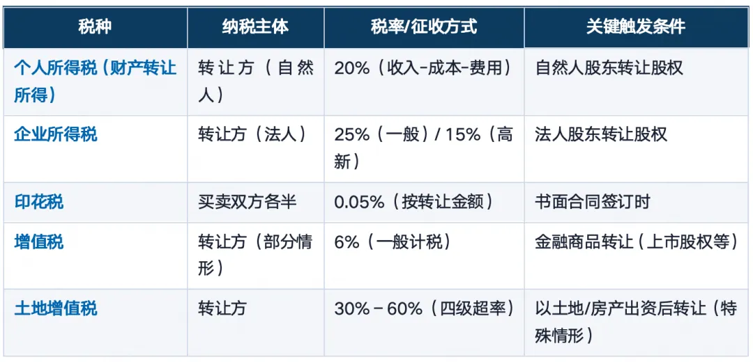 如果我们把这四种税放在一起审视,会发现它们并非独立运作,而是形成了一个相互牵连的税务生态:个税与企税,解决的是同一笔所得在不同纳税主体(自然人 vs 法人)下的负担分配。自然人税率20%、企业25%,差距并不大,但在持股架构设计上(是否设立持股平台公司),这5%的差距有时意味着数百万的税款差异,甚至在某些地区的税收优惠加持下,差距会更大。增值税,则从流转环节切入,理论上是价外税,但在股权交易中,买卖双方往往将其内化为谈判筹码,增值税负担的归属本质上是商业谈判的一部分。印花税,作为行为税,是国家对产权流转合法性的”背书费”,其法律意义大于经济负担意义。这四重税叠加在一起,使得股权转让的综合税负远比表面上的税率更为复杂,也使得税务筹划的空间与风险并存。
