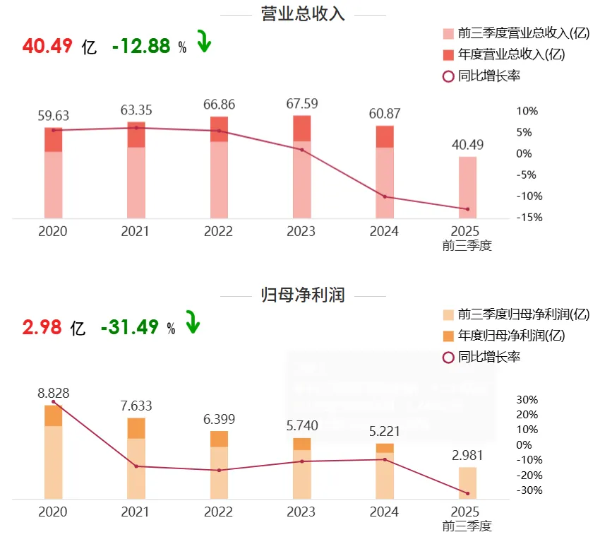 财报数据显示,公司2024年营收与归母净利润为上市后首次同步下滑,营收降至60.87亿元,同比下滑9.93%;归母净利润实现5.22亿元,同比下滑9.05%。进入2025年,公司业绩颓势不仅未扭转,反而加速下行,前三季度实现营收40.49亿元,同比下滑12.88%,归母净利润为2.98亿元,同比大跌31.49%。