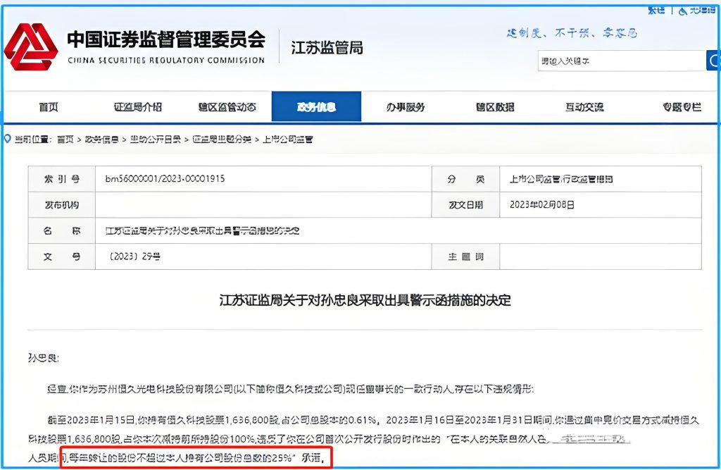 2023年02月08日,江苏证监局在官网的上市公司监管-行政监管措施栏目,公布了一则《对江苏证监局关于对孙忠良采取出具警示函措施的决定》。