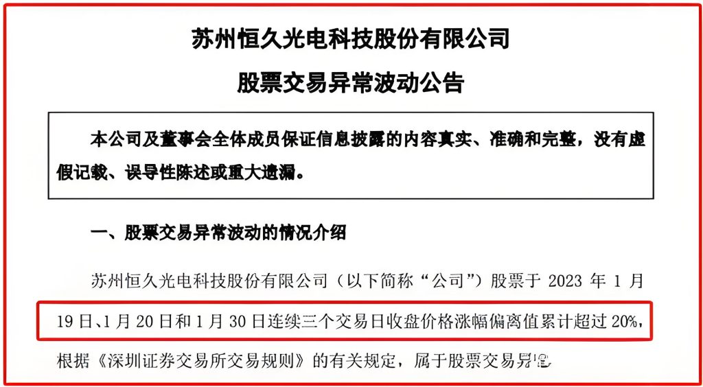 1月31日,出现了股票异常波动,上市公司发布公告,即连续三个交易日收盘价格涨幅偏离值累计超过 20%, 根据《深圳证券交易所交易规则》的有关规定,属于股票交易异常波动的情况。