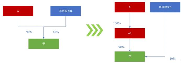 基于股权结构调整需要,A由直接持股甲公司变为通过A1间接持股甲公司。甲公司目前和变化后的股权结构如下: