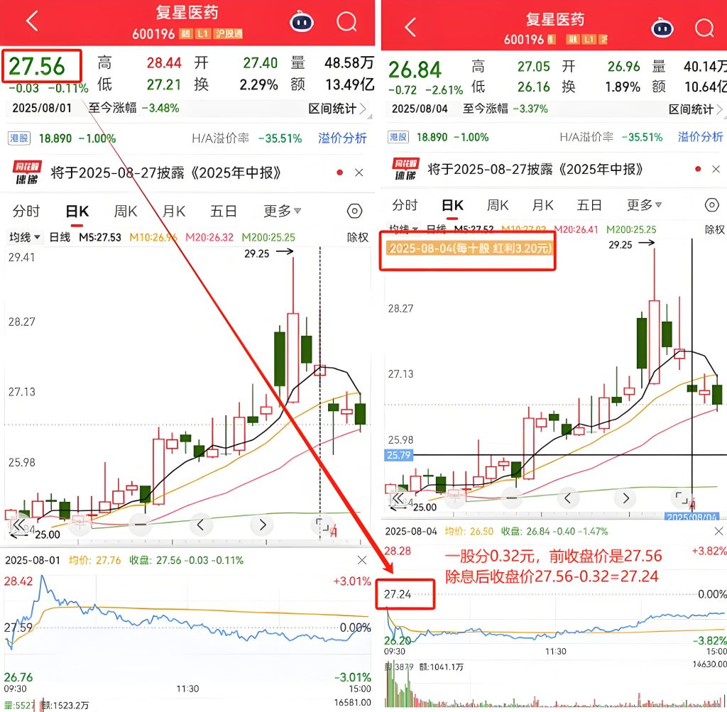 我们可以直接在行情软件上面查看具体除权除息后的股价。下图以复星为例,公告分红是每十股红利是3.2元,那么分红当天,就会从前一收盘价中剔出来0.32,所以4号看股票的分时会发现,前收盘价从27.56变到了27.24。