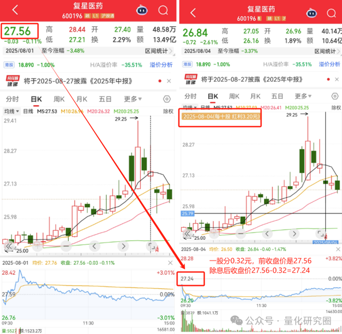我们可以直接在行情软件上面查看具体除权除息后的股价。下图以复星为例,公告分红是每十股红利是3.2元,那么分红当天,就会从前一收盘价中剔出来0.32,所以4号看股票的分时会发现,前收盘价从27.56变到了27.24。