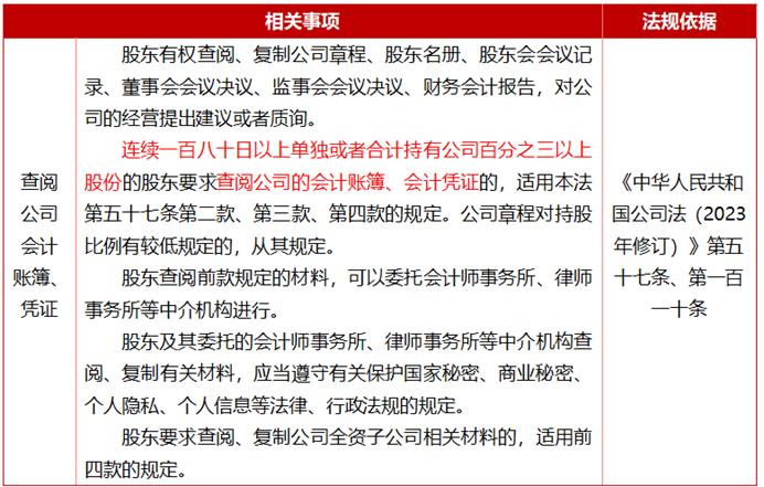 新《公司法》对查账持股比例门槛进行了补充规定,要求连续一百八十日以上单独或者合计持有公司百分之三以上股份的股东有权查账并将范围延伸至全资子公司,且公司章程可设更低的门槛。