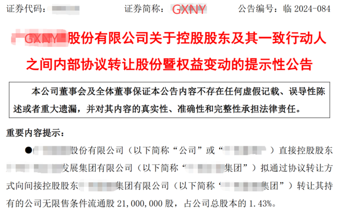 参考案例:《GXNY:关于控股股东及其一致行动人之间内部协议转让股份暨权益变动的提示性公告》
