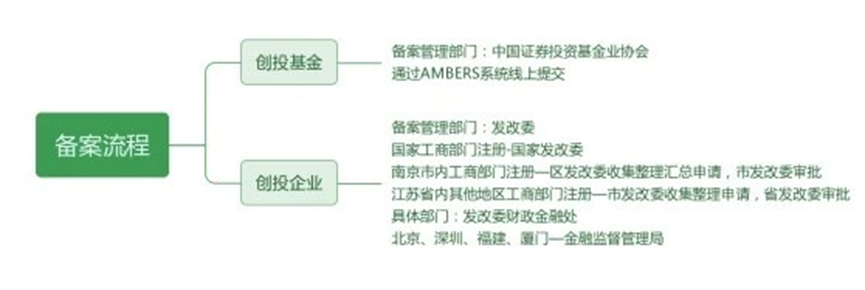 创业投资企业的备案管理部门分国务院管理部门和省级(含副省级城市)管理部门两级。国务院管理部门为国家发展和改革委员会;省级(含副省级城市)管理部门由同级人民政府确定,报国务院管理部门备案后履行相应的备案管理职责,并在创业投资企业备案管理业务上接受国务院管理部门的指导。