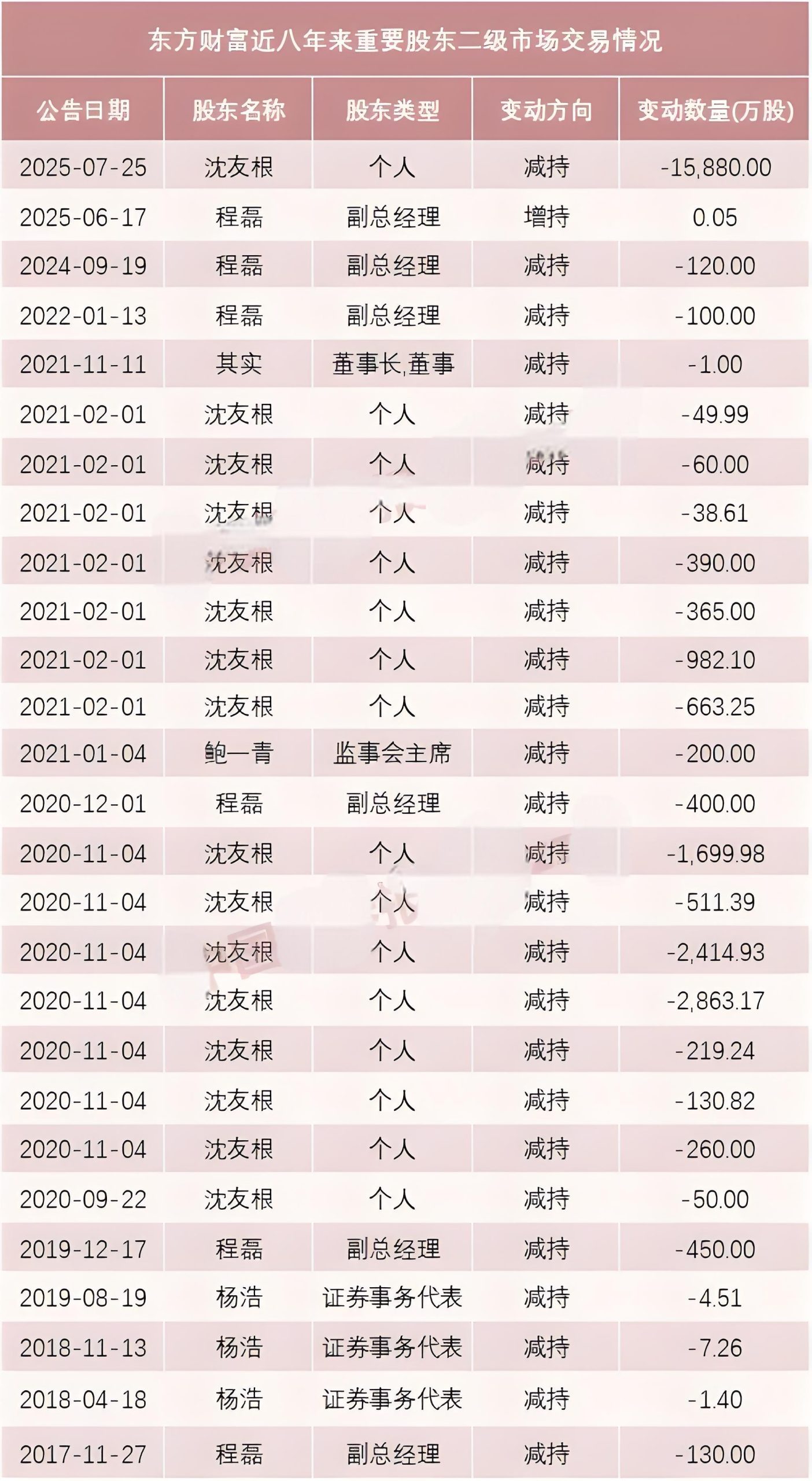 此前,沈友根曾通过集中竞价交易,多次减持东方财富股份。2021年2月,东方财富发布公告称,沈友根因个人资金需求,在2020年9月至2021年2月,通过集中竞价交易,累计减持1.07亿股公司股份,占公司总股本的1.24%,减持均价为26.95元/股,套现金额合计28.83亿元。