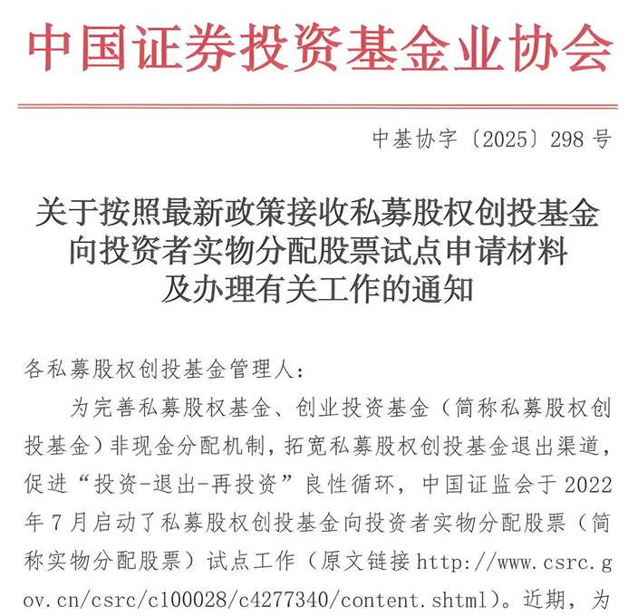 9月30日,中基协通过Ambers系统向各私募股权、创业投资基金管理人发布《关于按照最新政策接收私募股权创投基金向投资者实物分配股票试点申请材料及办理有关工作的通知》,在优化完善了实物分配股票工作机制和相关安排的同时,扩大了适用范围。