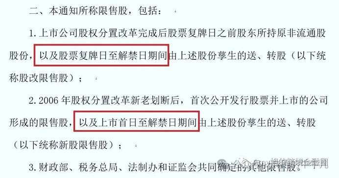 二、本通知所称限售股,包括:1.上市公司股权分置改革完成后股票复牌日之前股东所持原非流通股股份,以及股票复牌日至解禁日期间由上述股份孳生的送、转股(以下统称股改限售股);2.2006 年股权分置改革新老划断后,首次公开发行股票并上市的公司形成的限售股,以及上市首日至解禁日期间由上述股份孳生的送、转股(以下统称新股限售股);3.财政部、税务总局、法制办和证监会共同确定的其他限售股。三、个人转让限售股,以每次限售股转让收入,减除股票原值和合理税费后的余额,为应纳税所得额。即:应纳税所得额=限售股转让收入-(限售股原值+合理税费)应纳税额 = 应纳税所得额×20%