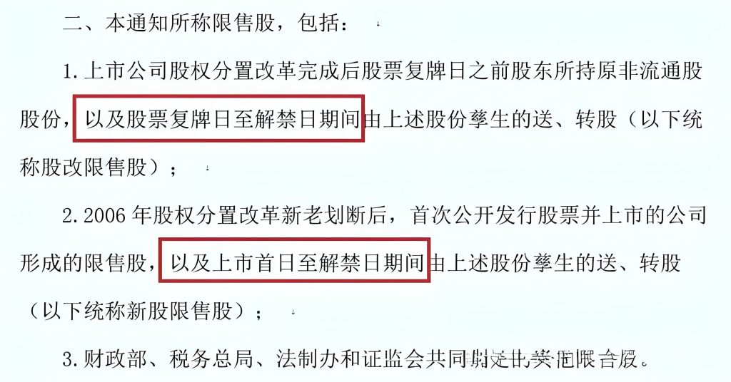 二、本通知所称限售股,包括:1.上市公司股权分置改革完成后股票复牌日之前股东所持原非流通股股份,以及股票复牌日至解禁日期间由上述股份孳生的送、转股(以下统称股改限售股);2.2006 年股权分置改革新老划断后,首次公开发行股票并上市的公司形成的限售股,以及上市首日至解禁日期间由上述股份孳生的送、转股(以下统称新股限售股);3.财政部、税务总局、法制办和证监会共同确定的其他限售股。三、个人转让限售股,以每次限售股转让收入,减除股票原值和合理税费后的余额,为应纳税所得额。即:应纳税所得额=限售股转让收入-(限售股原值+合理税费)应纳税额 = 应纳税所得额×20%