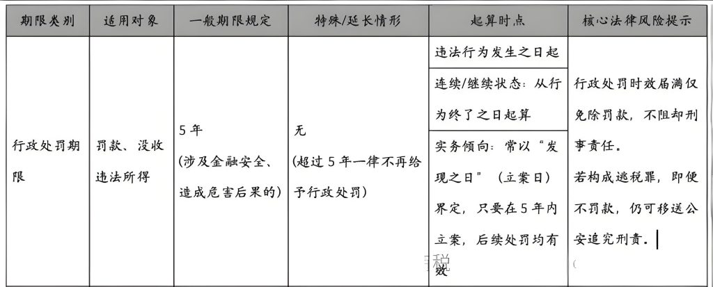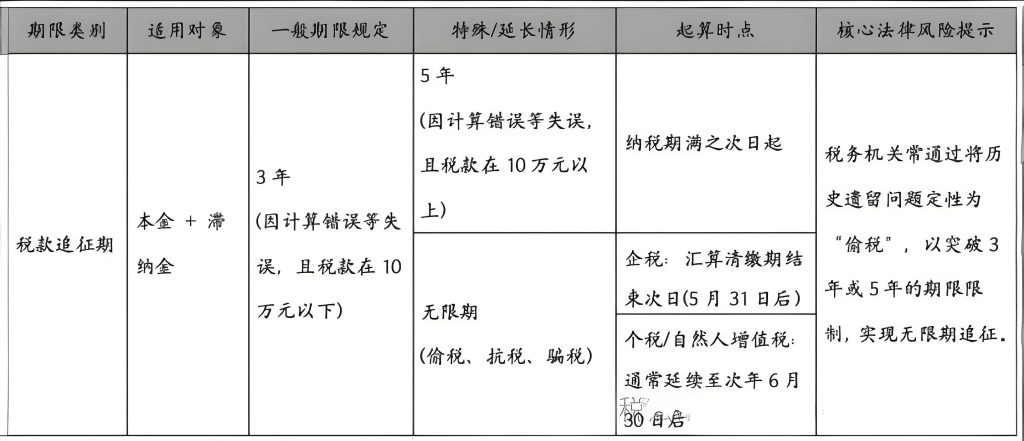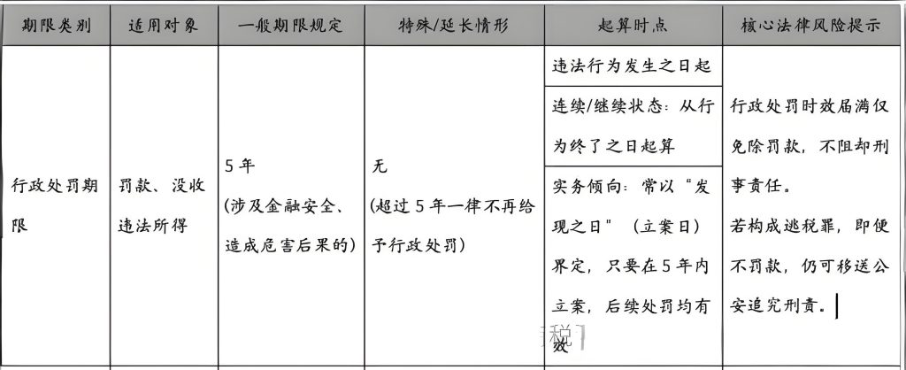 准确理解并运用这些期限规则,对于界定税务机关的执法边界、评估企业的历史税务风险以及确定刑事责任的追诉时效具有重要的法律意义。但在实践中,期间的适用问题容易混淆,本文为了方便纳税人理解相应期限的概念,将通过表格的形式,对税款追征期、行政处罚期限及涉税犯罪刑事追诉期限的法律逻辑、计算规则及特殊适用情形进行系统性解析,旨在为纳税人及法律从业者提供清晰的法律指引。