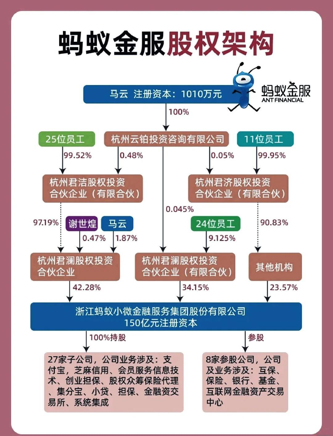给大家看一张图,这张图,是根据企查查上蚂蚁金服的股权架构图整理出来的,尽管我们做了简化,但是一眼看上去还是让人十分头疼,这里面究竟有多少真正可以开展实际业务的公司?哪些是纯粹的持股平台?如果没有深入了解他的业务,是很难进行区分的。