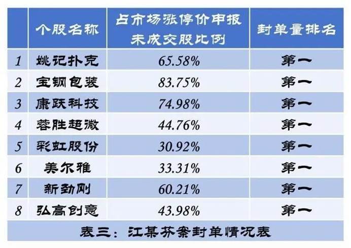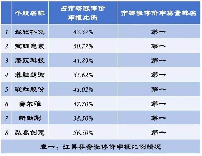 监管细则没有明确量化标准,结合江某芬案,我们认为涨停价申报比例占全市场40%以上,且在市场涨停价申买量中排名第一,存在违规交易风险