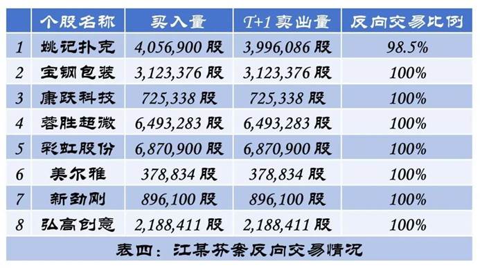 江某芬案中,监管部门对其涉及操纵的每一只个股的反向交易情况都进行了统计。比如其交易“彩虹股份”,账户共成交6,870,900股,成交金额总计52,629,298.00元,次日卖出6,870,900股,成交金额53,771,712.00元,获利1,073,745.69元。