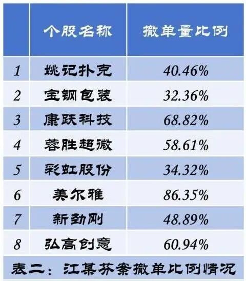 江某芬案中,监管部门对其涉及操纵的每一只个股都统计了撤单比例。比如:交易康悦科技撤回申报68.82%;交易蓉胜超微撤回申报58.61%;交易弘高创意撤回申报60.94%等等。
