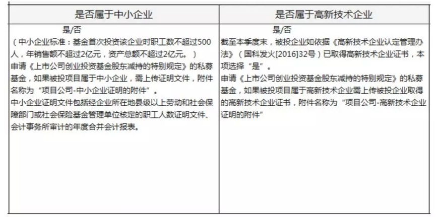 3、在填报产品季度更新“项目情况表”的“是否属于中小企业”、“是否属于高新技术企业”字段时,申请《特别规定》的基金需要上传有关附件,作为有关“早期中小企业”、“高新技术企业”的证明材料。