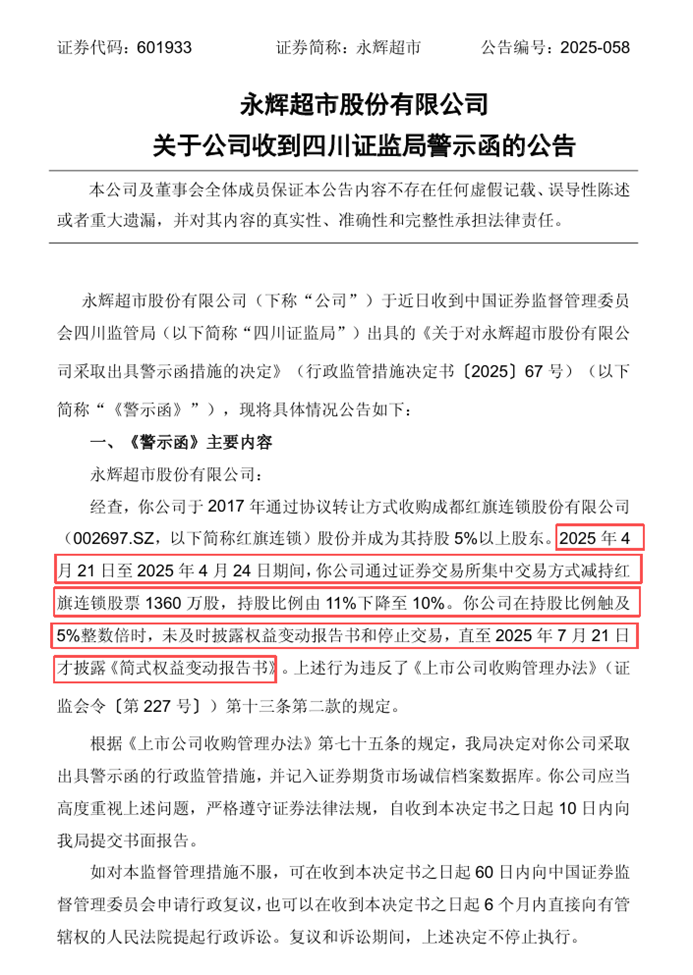 2025年9月27日,四川证监局就对永辉超市(601933.SH)减持红旗连锁(002697.SZ)出具警示函。原因同样为,在减持比例触及5%及其整数倍数时,未及时履行信披及暂停交易义务。该企业于2025年4月21日至2025年4月24日期间,你公司通过证券交易所集中交易方式减持红旗连锁股票1360万股,持股比例由11%下降至10%。在减持比例触及5%及其整数倍数时,未及时履行信披及暂停交易义务。