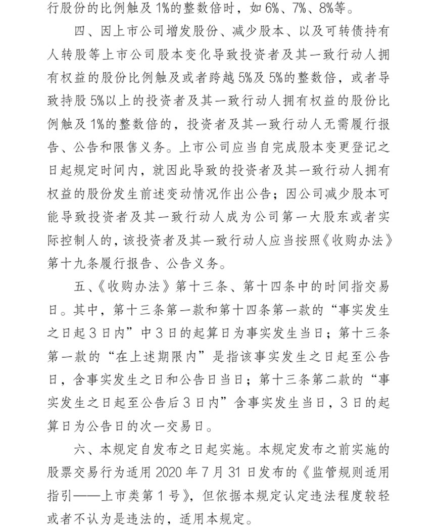 为此,2025年1月10日,证监会发布《证券期货法律适用意见第19号——<上市公司收购管理办法>第十三条、第十四条的适用意见》,对《上市公司收购管理办法》第十三条、第十四条进行解释:明确投资者权益变动的刻度标准,为触及5%或1%的整数倍;