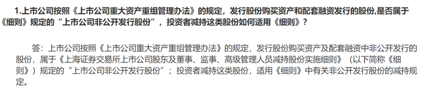 注:问题解答的意思是发行股份购买资产及配套融资的股份视同《减持细则》中所提到的非公开发行股份,实际的意思是属于特定股份,并非就叫非公开发行股份。而且回答中也点名发行股份购买资产适用的是《上市公司重大资产重组管理办法》,和非公开发行股份所适用的规则并不一样。那么为啥减持新规中仅提了非公开发行股份呢?我猜是因为当时规则制定的仓促导致具体条款并没有考虑特别的全面和完善,比如: