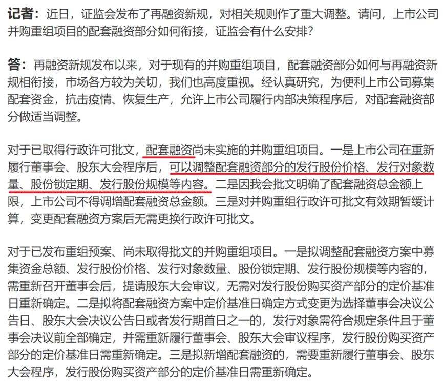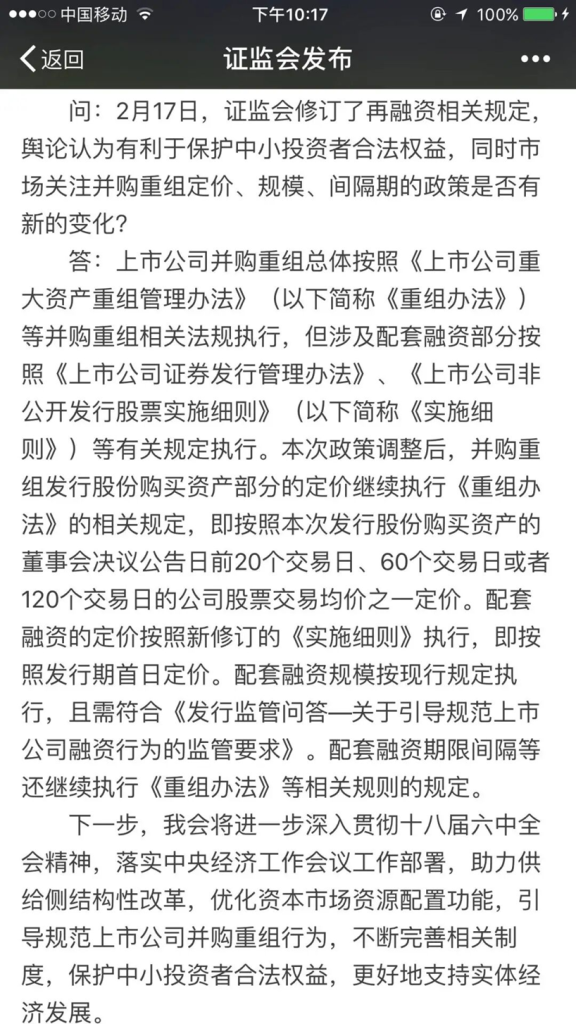 注:上文所提的其实只是定价和锁定期是参考非公开发行的要求,而且仅仅只配套融资的部分,并不涉及发行股份购买资产。其实这个文件不是新要求,2017年的时候也整过一次(针对当时再融资规则的调整),不过那次说的更加明确一些: