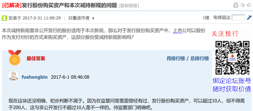 嗯嗯,上面说的很清楚了,发行股份购买资产的定价规则不受再融资规则的影响。即按照本次发行股份购买资产的董事会决议公告日前20个交易日、60个交易日或者120个交易日的公司股票交易均价之一定价。并购重组涉及配套融资(配融定增)的定价按照再融资规则来,嗯嗯,看清楚是定价,是定价,并没有说所有的都和非公开的要求一样,这个所有要求就含减持退出的要求啦。