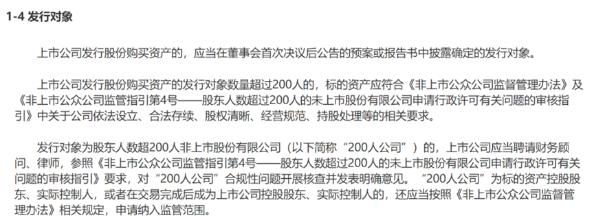 上述10人指再融资新规颁布前的要求,现在是35人,但是同样和发行股份购买资产的200人的线是不一样。这个200人的出处来自于《监管规则适用指引——上市类第1号》: