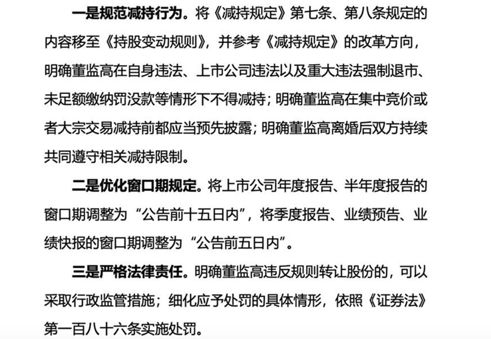 而本次修订后的《持股变动规则》,吸收整合了《减持规定》中有关规范董监高减持股份的要求,进一步明确董监高离婚分割股票后各方持续共同遵守原有的减持限制。其次,优化了禁止买卖股票的窗口期,支持董监高依法增持股份。将上市公司年度报告、半年度报告的窗口期调整为“公告前十五日内”,将季度报告、业绩预告、业绩快报的窗口期调整为“公告前五日内”。此外,严格法律责任。明确董监高违反规则转让股份的,可以采取行政监管措施。细化应予处罚的具体情形,依照《证券法》第一百八十六条实施处罚。