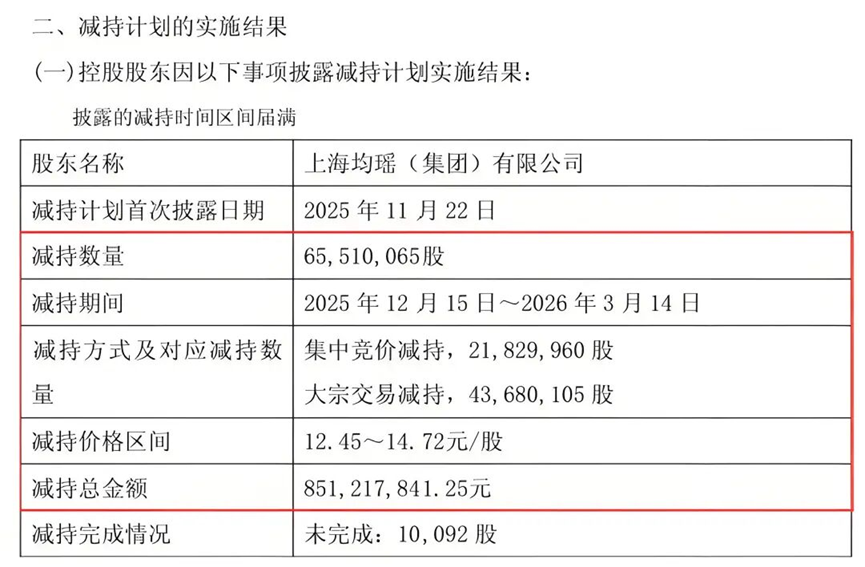 根据《关于控股股东减持股份结果公告》,均瑶集团于2025年12月15日至2026年3月14日期间,通过集中竞价交易减持2182.996万股,通过大宗交易减持4368.0105万股,合计减持6551.0065万股,占公司总股本的3.00%,减持价格区间为12.45元/股至14.72元/股,减持总金额达851,217,841.25元。