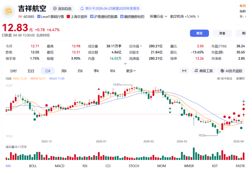 二级市场上,吉祥航空股价表现不佳。截至4月8日收盘,公司股价报12.83元/股,较上市初期高点已近腰斩。2026年以来,股价累计跌幅达19%。
