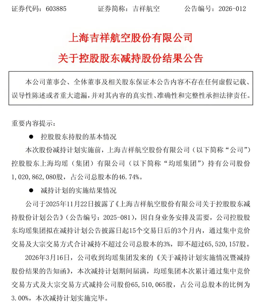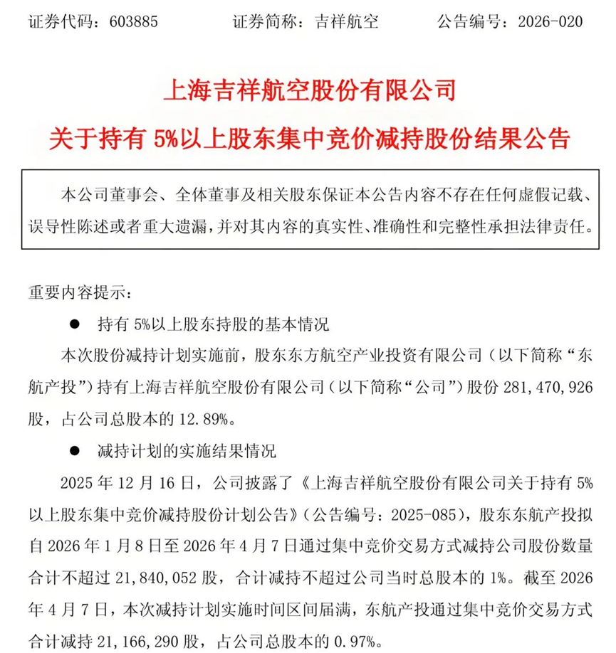 近日,吉祥航空(603885.SH)发布公告,第二大股东东方航空产业投资有限公司(下称“东航产投”)已完成为期三个月的集中竞价减持计划。