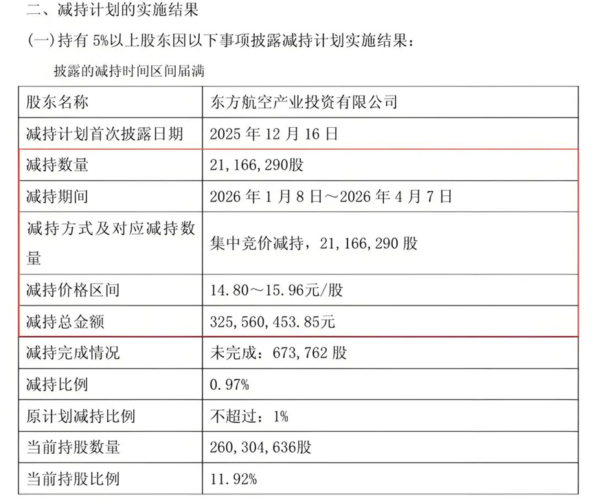 公告显示,东航产投于2026年1月8日至4月7日期间,以14.80元/股至15.96元/股的价格,累计减持2116.63万股,减持总金额约3.26亿元。减持后,东航产投持股比例由12.89%降至11.92%,仍为持股5%以上重要股东。