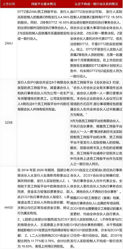 因此,普通合伙人虽因有权代表有限合伙企业执行事务而在通常情况下被直接认为对其形成控制关系,但若合伙企业通过合伙协议另行约定诸如合伙人会议或管理委员会等决策机制,使其他有限合伙人实际得以支配合伙企业或施加重大影响,其实际控制关系仍可能存在一定变化,实践中有少量上市公司曾在IPO时做过此类推翻论证(见下表ZAMJ案例)。由此可见,控制关系的认定还是需要审视合伙协议相关约定,综合对合伙事务决策尤其是对上市公司表决权行使的实际影响程度来进行判断。若实控人/大股东作为有限合伙人仅持有部分合伙份额,依据合伙协议和其他安排也不能控制或影响持股平台的管理运作,更不能对执行事务合伙人的产生、变更或是对上市公司表决权的行使产生重大影响,在论证充分的情况下是可以不认定同员工持股平台存在一致行动关系的(见下表SZXB、HHSD案例)。实践中存在的部分案例如下: