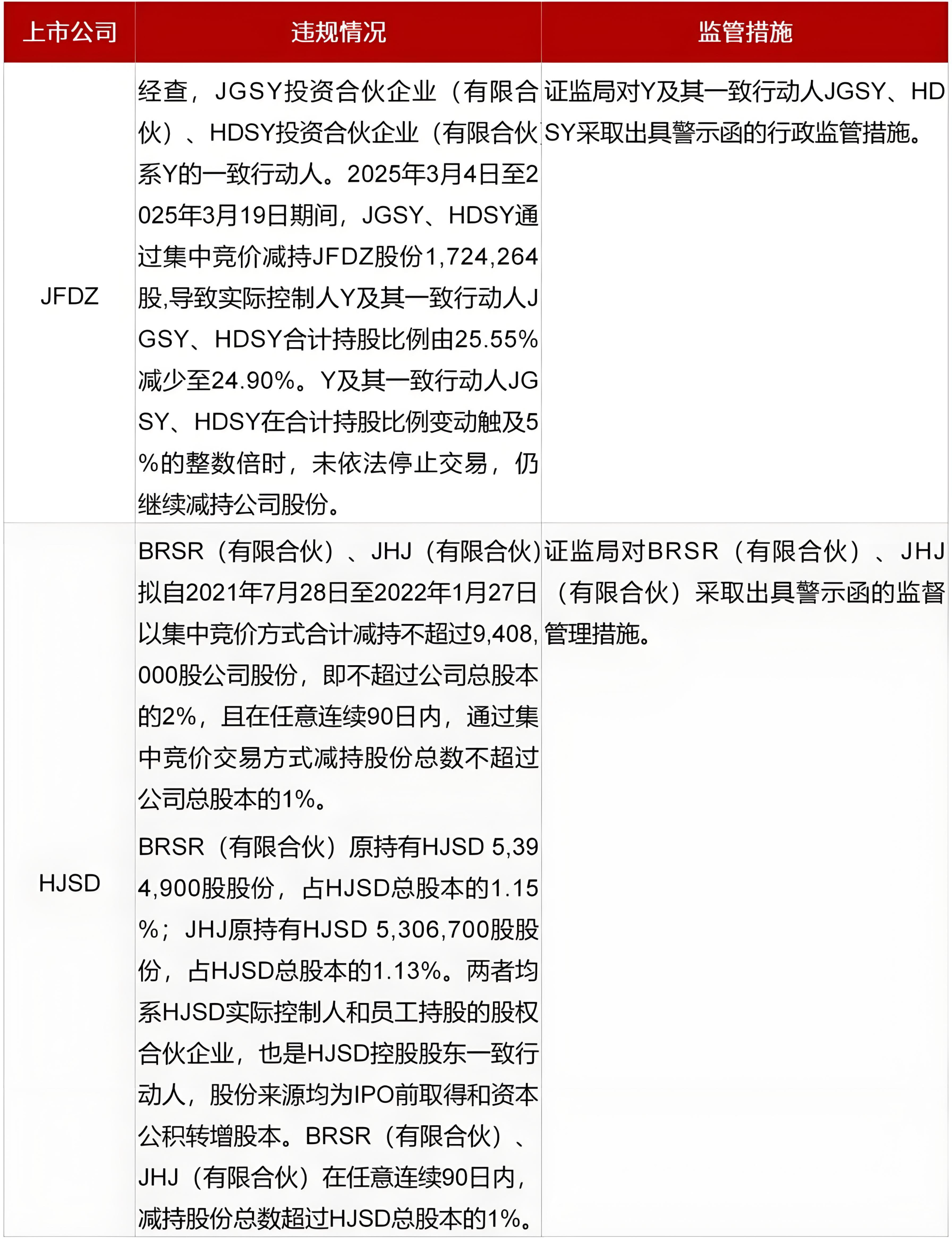 据此,若员工持股平台构成实控人/大股东的一致行动人,其减持也将受到相应限制。例如,员工持股平台需遵守针对实控人/大股东减持的禁止性规定;需与实控人/大股东共享减持额度,合并计算权益变动并履行披露义务;通过集中竞价或大宗交易减持,首次卖出前15个交易日需预披露等,具体减持规则可参考过往文章《上市公司大股东合规减持股份指南》。所以,在构成实控人/大股东一致行动人时,实施减持时务必对相关要求多加关注,规避违规风险。以下是实践中存在的部分因忽视一致行动关系而违规的案例: