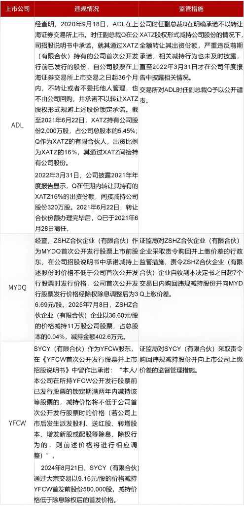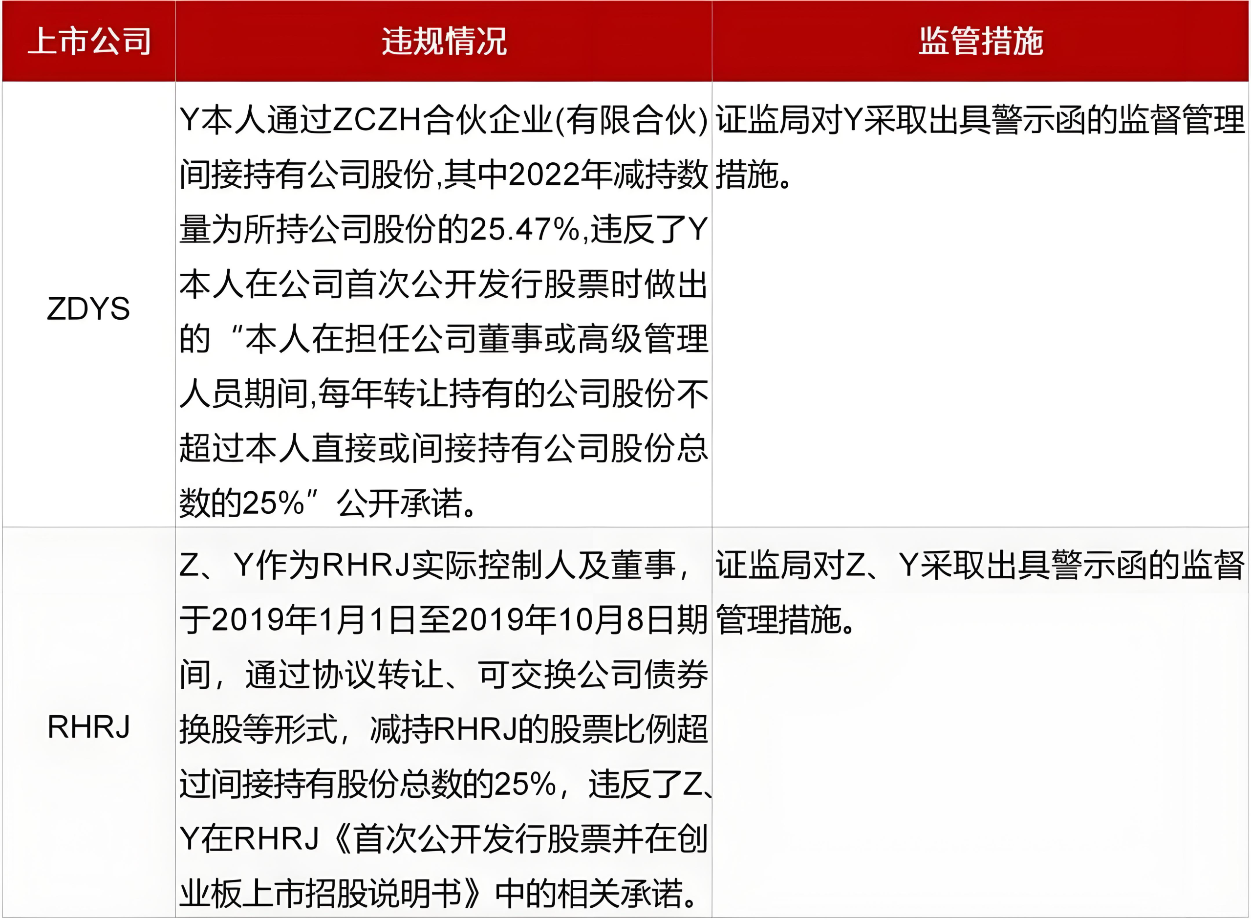 此处需要特别注意的是,上市公司员工持股平台的激励对象中往往可能存在董事、高级管理人员。根据现有规则,上市公司董事和高级管理人员需要遵守每年减持不得超过其所持上市公司股份总数的25%的规定,且从目前的规则解读和监管口径看,这25%的比例限制仅针对直接持股部分。但上述人员一般会在IPO时对上市后的股份减持作出公开承诺,其中可能涉及间接持股。如果上述主体对间接持股减少的比例上限等也曾有公开承诺,例如每年减持间接持有的股份也不得超过25%,那员工持股平台的减持就必须关联激励对象个人的持股变动。因此,在持股平台实施减持时,企业务必仔细核查相关激励对象是否曾作出此类关于间接持股变动的公开承诺,要精确计算拟减持操作将导致相关人员间接持股变动的比例,确保减持计划不超出其承诺的限制(如年度减持比例上限),避免因违反公开承诺而招致监管处罚。以下是市场中部分未注意间接持股减少而违反公开承诺的案例: