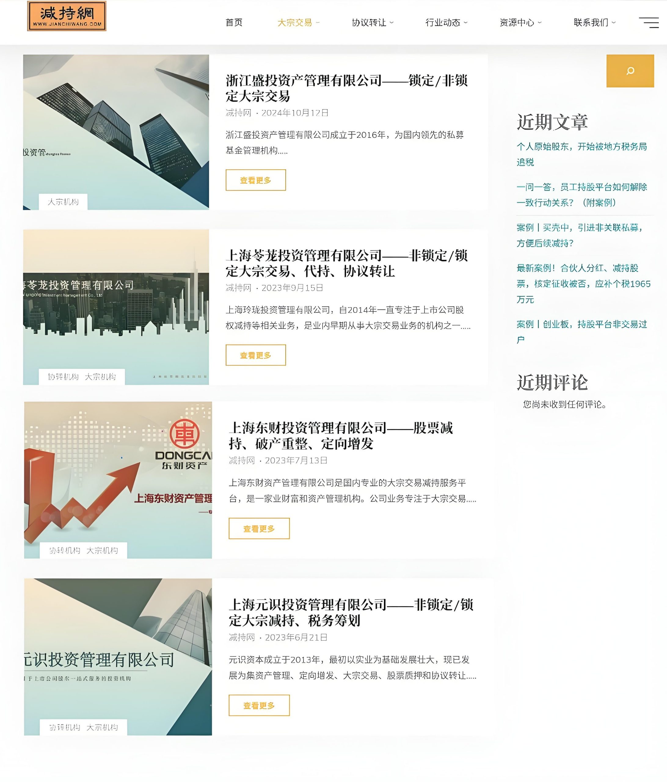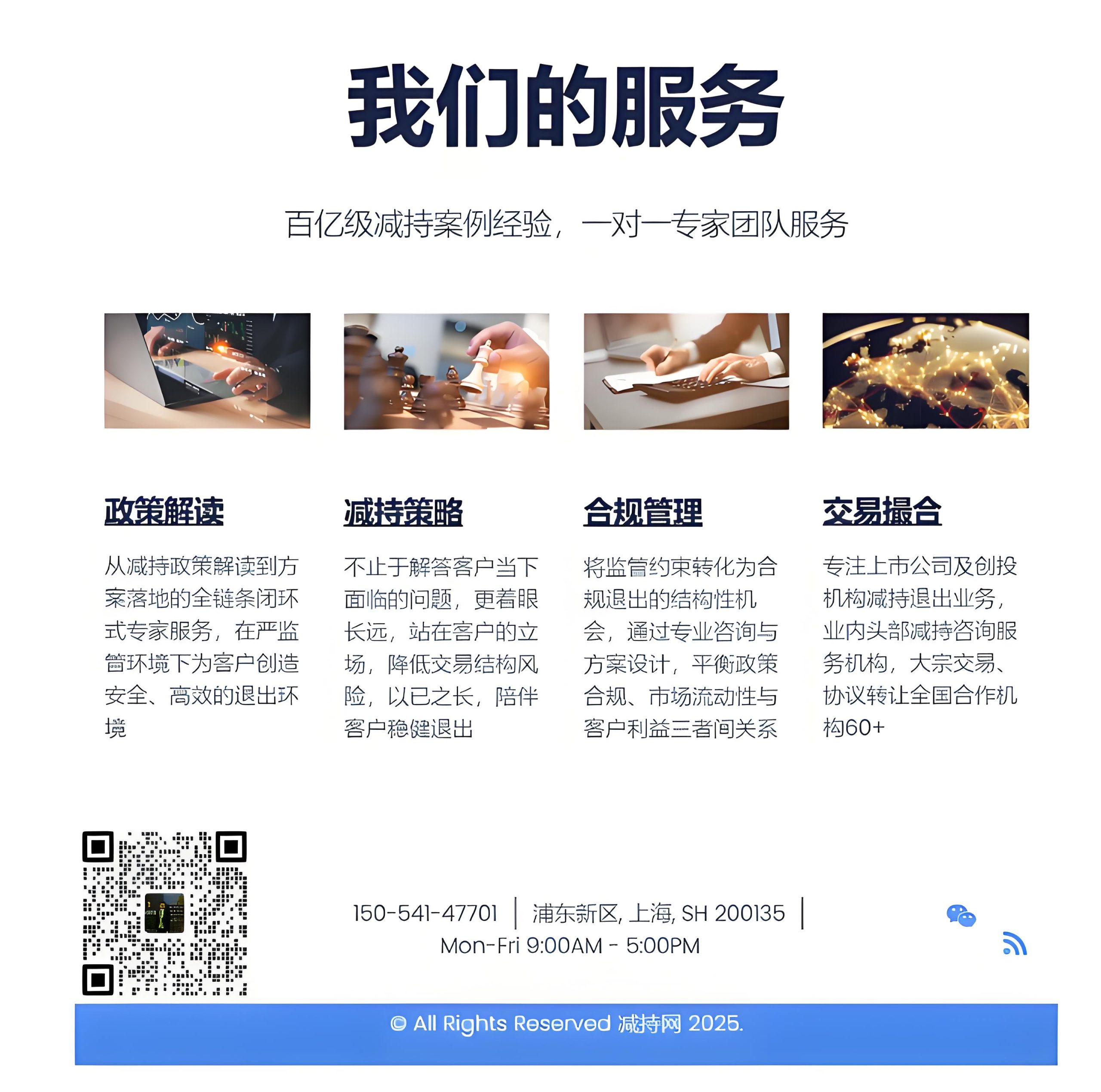 政策解读 商务合作 | A股上市公司减持退出商务合作 减持网 2025年7月31日 2025年9月25日 合作内容: 寻求可承接上市公司/创投基金,股票减持退出合作资方,共同为股东提供专业化减持及配套增值服务,欢迎业内各减持机构、公/私募基金、市场化资方,沟通交流合作事宜; 业务范围: 1. 非锁定/锁定大宗交易(6个月锁定期,30万股/200万及以上) 2. 账户内保底代卖 3. 协议转让(12个月锁定期,5%比例及以上) 4. 质押式回购交易违约处置(以协议转让方式,2%比例及以上) 5. 限售股场外质押 部分合作机构一览: