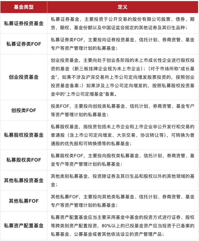下表汇总了中基协产品备案系统对于私募基金类型的详细定义。