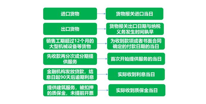 (一)纳税人生产销售生产工期超过12个月的大型机械设备、船舶、飞机等货物,纳税义务发生时间为收到款项或者书面合同确定的付款日期的当日。 (二)纳税人销售服务,先收取价款再分期或者分次提供服务的,以首次提供服务的实际开始当日和合同约定的当日,按照孰先原则确定纳税义务发生时间,纳税人应当就收到的全部价款申报缴纳增值税。 (三)纳税人销售不动产,完成权属登记或者实际交付不动产,属于增值税法实施条例第三十九条、第四十条所称的不动产转让完成;完成权属登记且实际交付不动产的,按照孰先原则确定不动产转让完成的时间。 (四)金融机构发放贷款后,自结息日起90天内发生的应收未收利息按现行规定缴纳增值税,自结息日起90天后发生的应收未收利息暂不缴纳增值税,待实际收到利息时按规定缴纳增值税。