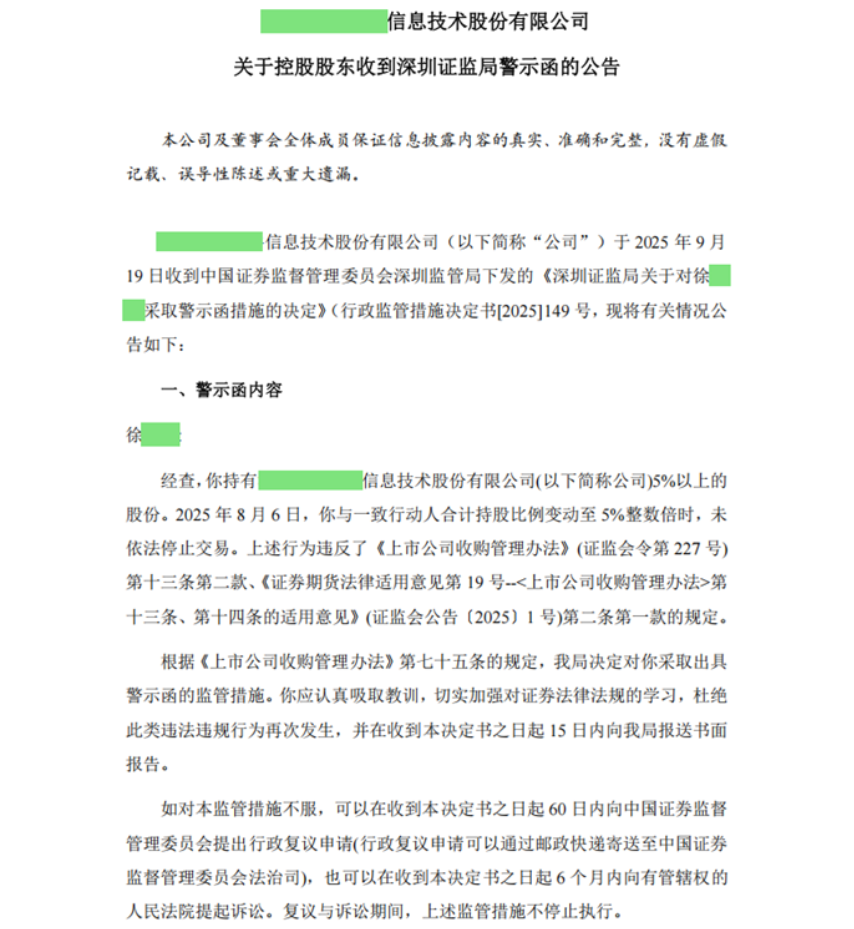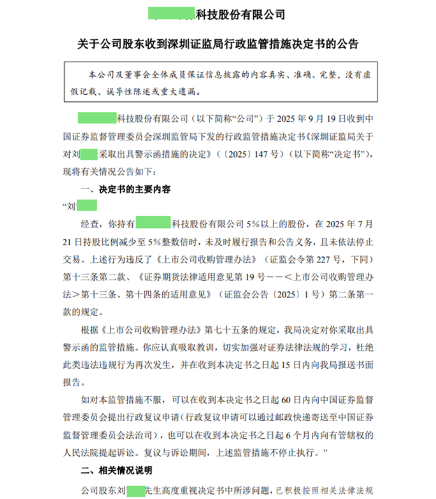 2025年9月19日收市后,广东有多家上市公司持股5%以上股东收到深圳证监局的警示函。