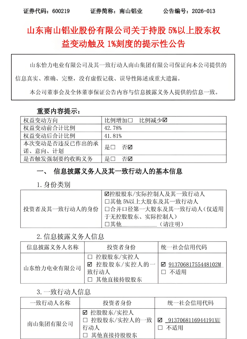 此外,1月14日,南山铝业曾发布股份回购公告,公告中称,经公司问询,截至本公告披露日,公司董事、高级管理人员、实际控制人、控股股东及一致行动人,在未来3个月、未来6个月内均无股份减持计划。若上述主体后续拟实施股份减持计划,公司将按照相关规定及时履行信息披露义务。