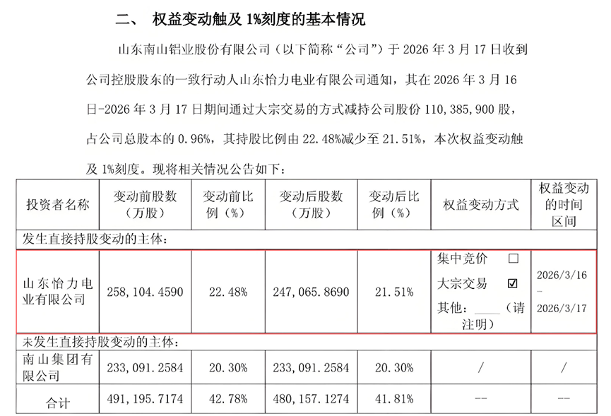 3月17日,南山铝业公告称,公司控股股东南山集团有限公司的一致行动人怡力电业,于3月16日至3月17日通过大宗交易方式合计减持公司股份约1.1亿股,占公司总股本的0.96%,本次权益变动触及A股权益变动1%的信披刻度。