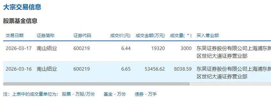 另据交易所公开数据,3月16日至17日,南山铝业大宗交易卖方均为中信证券大连分公司,买方均为东吴证券上海浦东新区世纪大道营业部。3月16日成交8038.59万股,成交金额5.35亿元;3月17日成交3000万股,成交金额1.93亿元。以此计算,怡力电业本次减持套现超7.2亿元。