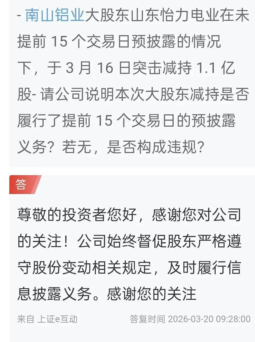 南山铝业在互动平台回复称,公司始终督促股东严格遵守股份变动相关规定,及时履行信息披露义务。