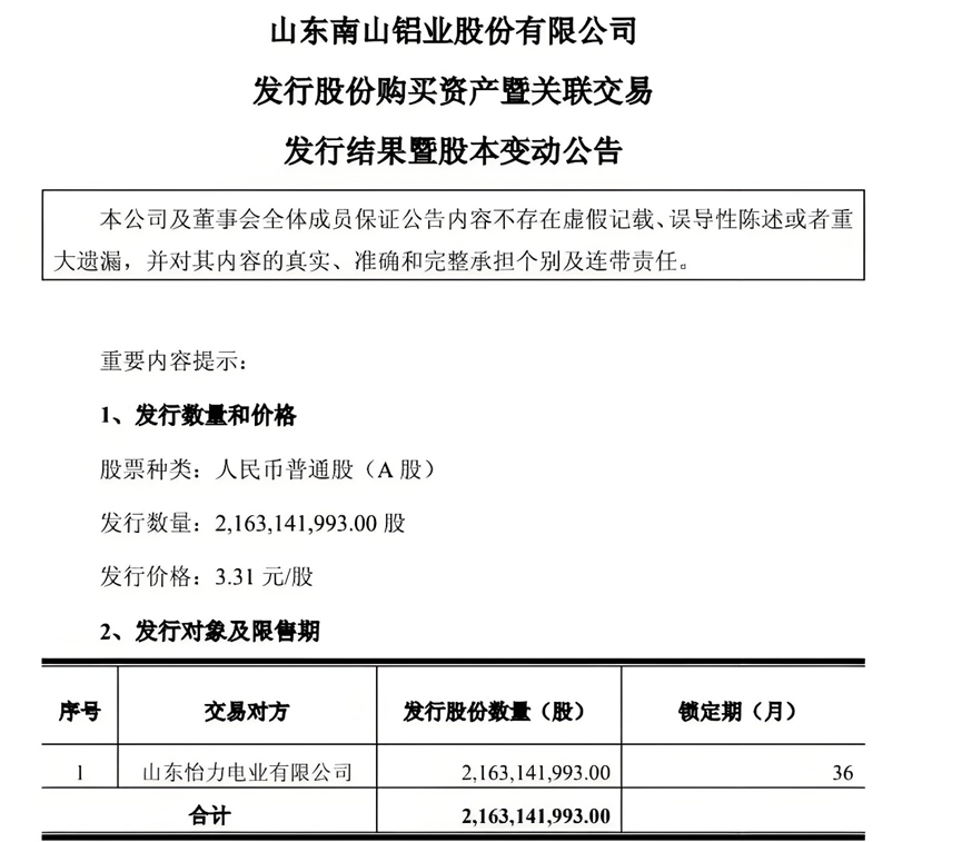 据南山铝业此前公告,2016年南山铝业曾向怡力电业定增21.6亿股,发行价格为3.31元/股。