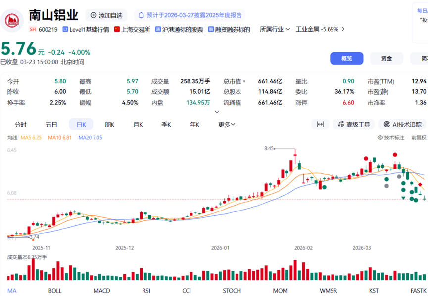 大股东减持公告发布后,南山铝业股价持续下滑,3月17日至3月23日,公司股价累计下滑超19%。截至3月23日收盘,公司股价报5.76元/股,市值661亿元。