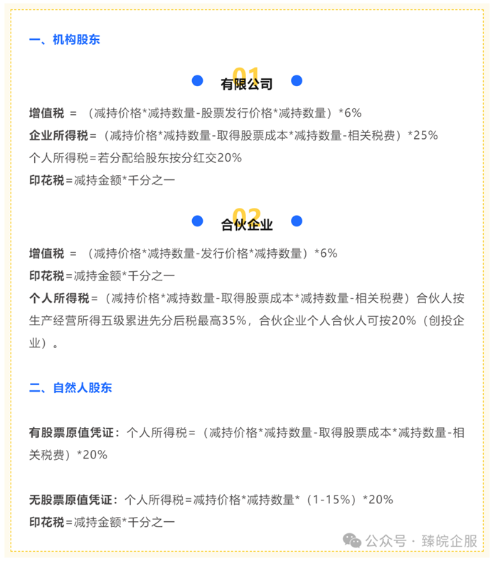 上市公司大股东在减持的过程中,会涉及增值税、企业所得税、个人所得税等不同税种。具体如下: