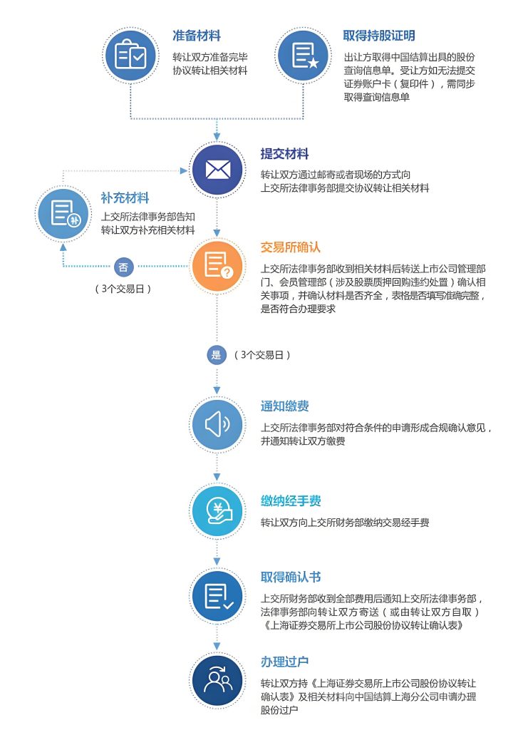 a.协议转让:依据《上市公司非流通股股份转让业务办理规则》、《上市公司非流通股股份转让业务办理实施细则》、《上市公司流通股协议转让业务办理暂行规则》及《上海(或深圳)证券交易所上市公司股份协议转让业务办理指引》等规定,向上/深交所提交协议转让申请,由交易所审核后,出具合规确认意见。转让双方持合规确认意见,前往中国证券登记结算有限责任公司办理股份过户手续。