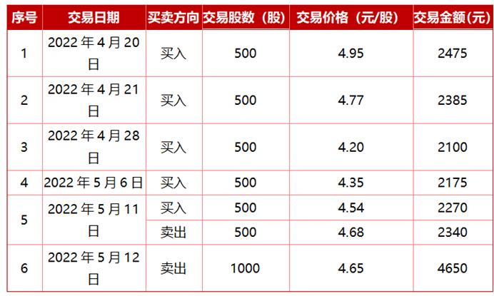 期间买入价格从低到高排序为:4.20元(500股)、4.35元(500股)、4.54元(500股)、4.77元(500股)、4.95元(500股);