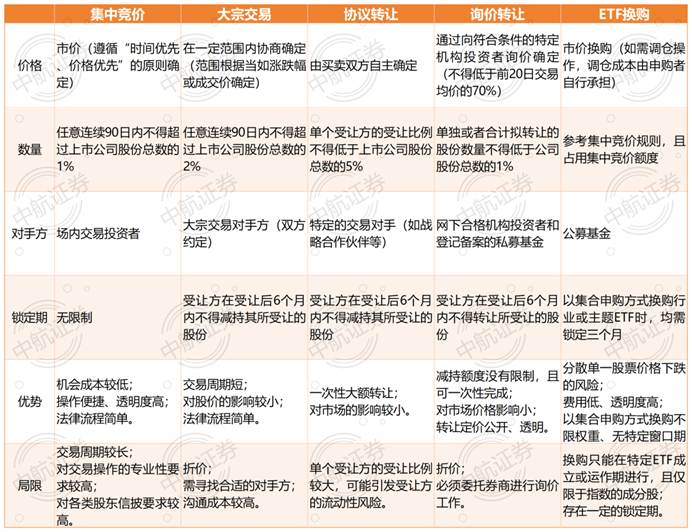 目前,上市公司股东参与资本市场增减退等交易使用的工具主要包括但不限于:集中竞价交易、大宗交易、协议转让、询价转让以及ETF换购五种。