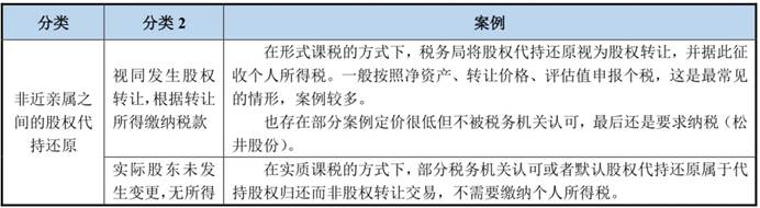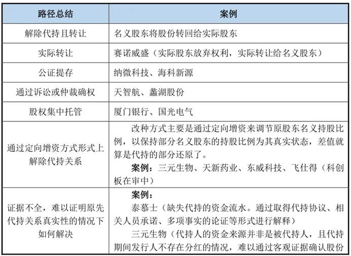 1、已还原的股份代持是否真实且彻底清理一是代持关系的真实性。出资来源、分红去向等银行流水是证明代持关系真实存在最重要的客观证据。但是,部分项目可能由于股份代持形成的时间较为久远,无法取得客观证据或证据不足,导致削弱了股份代持真实性的论证。二是代持行为的合法合规性。部分发行人隐名股东因具有公务员、国家公职人员、竞业禁止人员、外籍人士或机构(部分行业存在外资限制)等特殊身份,可能存在股东身份不适格的问题。针对此类问题,除需结合相关法律法规论证代持行为的合法合规性,确认是否存在现实或潜在争议纠纷并评估是否对发行人上市产生不利影响之外,一般还要求取得主管部门对代持行为不构成重大违法违规的书面确认。三是代持还原的合法合规性。目前股份代持还原的税务问题尚无定论,各地税务机关具有一定的自由裁量权,还原过程可能存在一定的税务风险。四是代持行为解除的彻底性。为了规避代持对发行人股权结构的不利影响,确保上市后不因此发生纠纷,保荐机构应当对代持双方实地访谈,关注代持解除时转让价格、价款支付方式等安排是否合理,并取得双方关于曾存在代持关系但已完全解除、不存在纠纷或潜在纠纷的书面确认,有条件的情况下还可以对书面确认文件进行公证,以此加强上述文件的说服力。2.未还原的股份代持处理是否得当实务中,也可能存在部分隐名股东或显名股东不愿意配合发行人进行股份代持还原的情形。这种情形下也并非完全无法处理,如后面总结的公证提存、股权集中托管等手段。