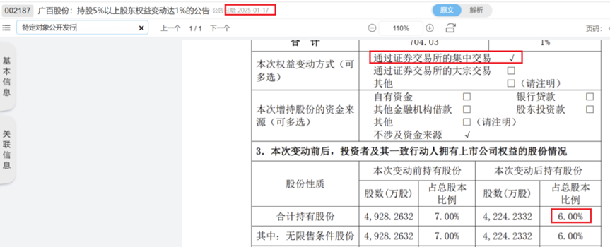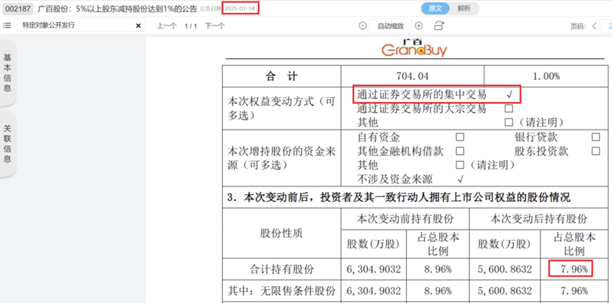 广州市广百股份有限公司持股5%以上股东中银金融资产投资有限公司,连续4个交易日三次发了触及1%的公告,股份自8.96%减持至6%,不涉及预披露减持计划,不涉及90天1%的限制。股份来源是: